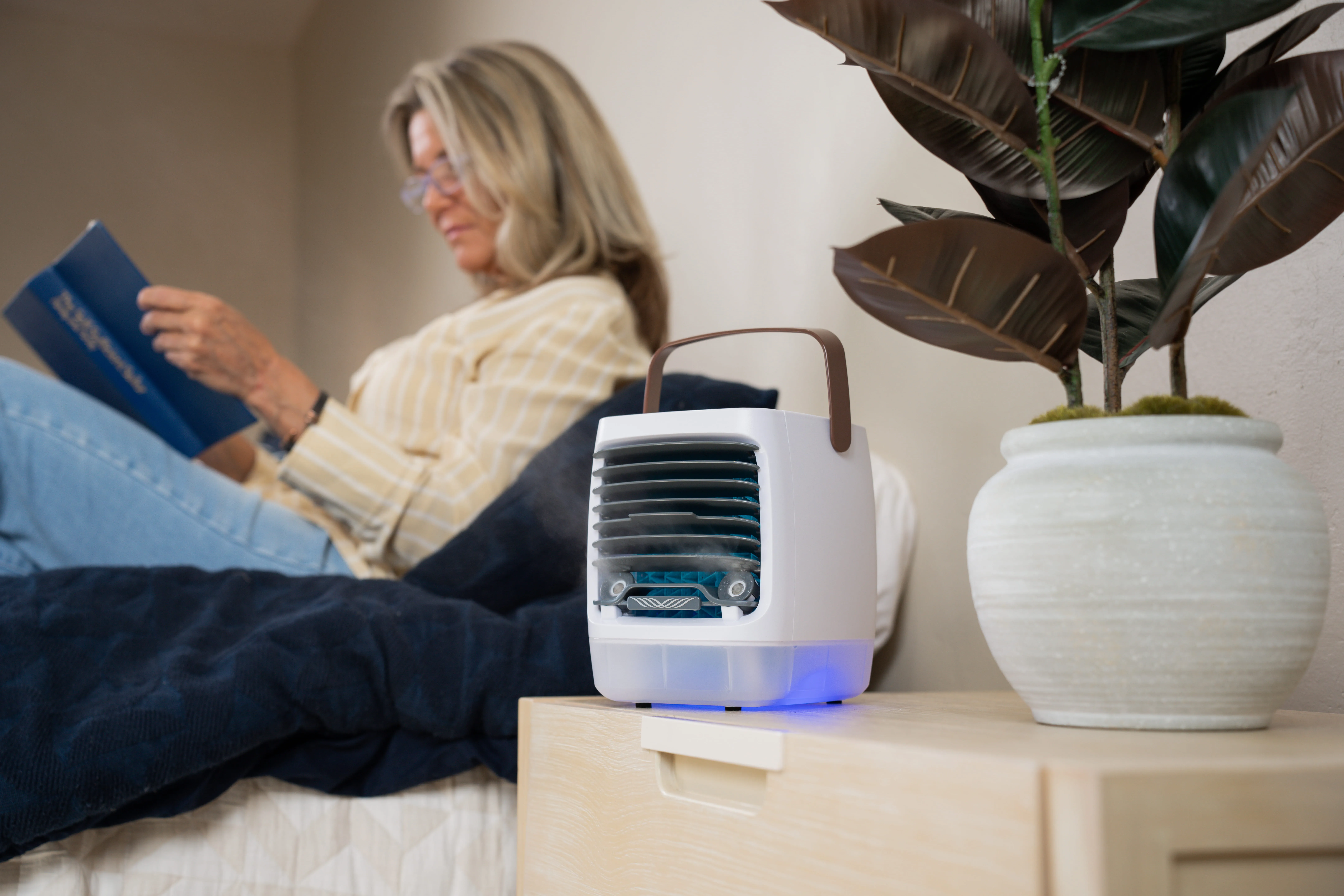 "Battery-powered air cooler," Linda said. "For when the power goes out. And it cuts your electric bill in half."