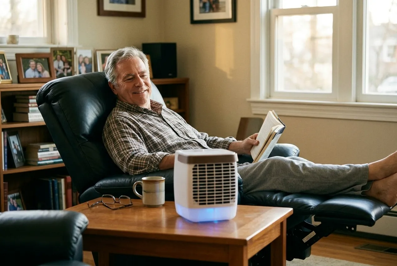 I sat in my recliner with it on the coffee table. Within 5 minutes, the air around me was noticeably cooler. I could feel the boundary — step 4 feet away and it was warm again. Sit back down and it was comfortable.